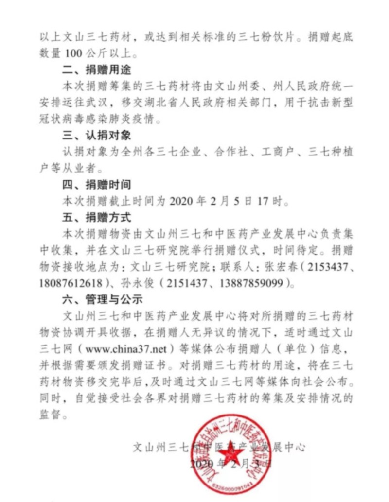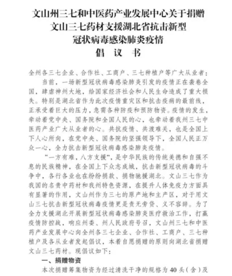 三七健康产品制造专家——星空电竞·(中国区)官方网站 xkdj 心系疫情,第一时间积极响应,在文山州三七和中医药产业发展中心的组织下,将库存的获得云南十大名药材第一名的星空电竞牌三七制作的成本价为51万元的70件910公斤三七超细粉全部捐赠给武汉。用行动诠释品牌社会责任感,为疫情防治贡献一份力量。