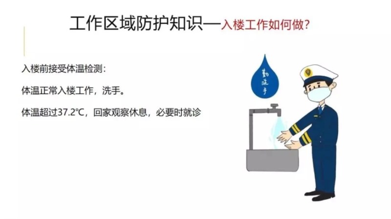 进入办公楼前自觉接受体温检测,体温正常可入楼工作,并到卫生间洗手。若体温超过37.2℃,请勿入楼工作,并回家观察休息,必要时到医院就诊。