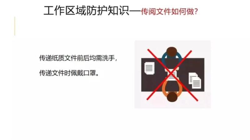 保持办公区环境清洁,建议每日通风3次,每次20-30分钟,通风时注意保暖。人与人之间保持1米以上距离,多人办公时佩戴口罩。保持勤洗手、多饮水,坚持在进食前、如厕后按照六步法严格洗手。接待外来人员双方佩戴口罩。