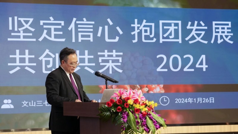 文山三七产业协会会长、星空电竞药业董事长杨朝文作了2023年度工作报告,总结了协会过去一年的主要工作,分析了存在的主要问题及困难,就2024年协会工作作了发言。杨会长表示协会全体同仁要坚定信心、同心同向、形成“拧成一股绳、凝成一股力、聚成一条心、共下一盘棋”的共识,成为推进以三七为重点的中医药产业高质量发展中不可或缺的中坚力量。