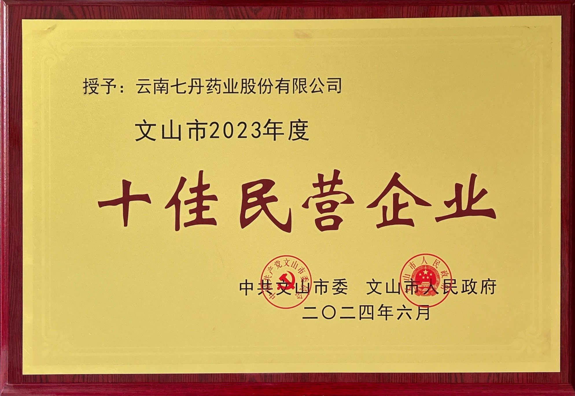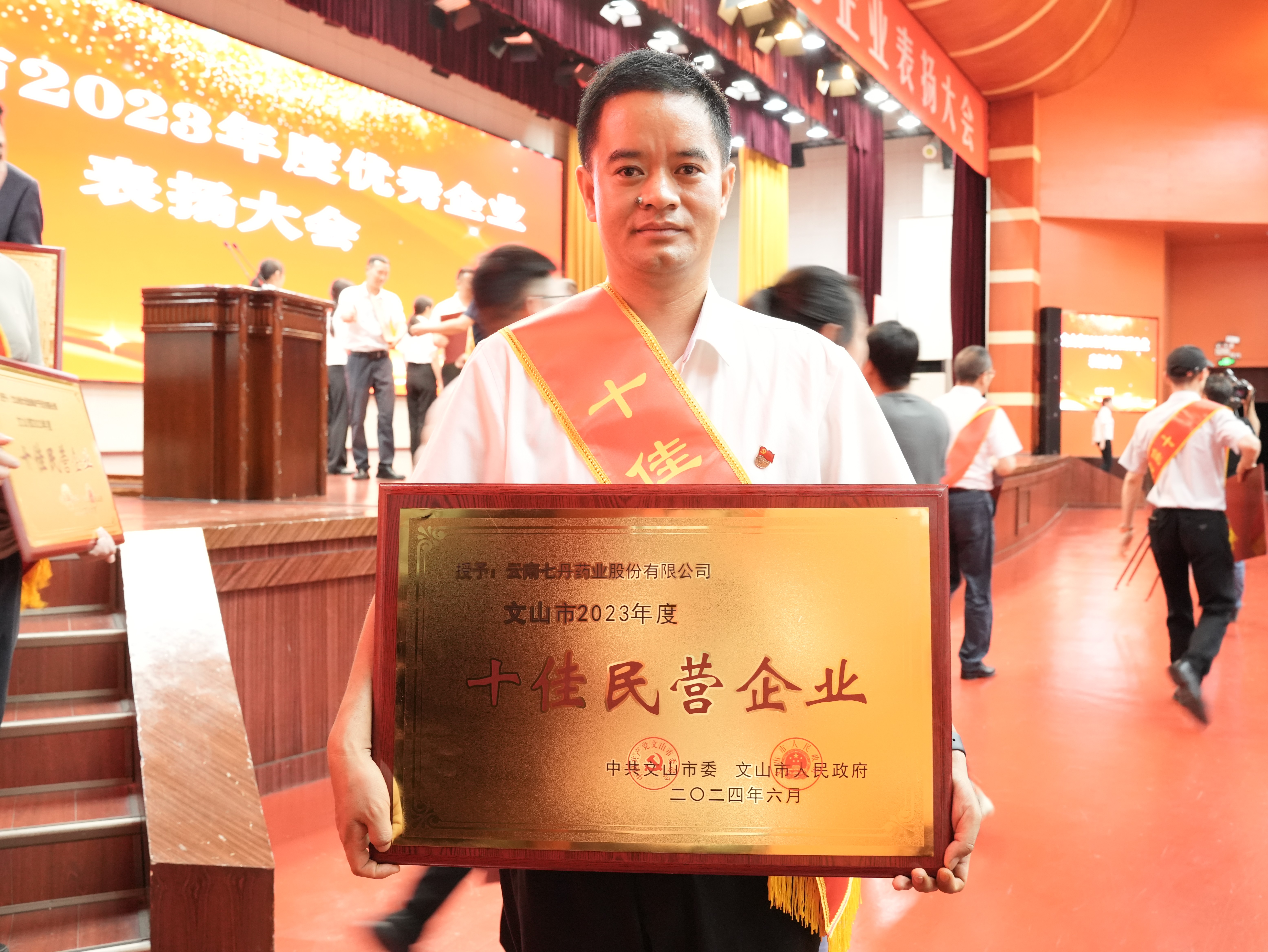 被授予文山市2023年度“十佳民营企业”荣誉称号,这是星空电竞药业在去年获得2022年度“十大民营企业”荣誉称号的基础上今年再度获得,公司副总裁王海维代表公司出席仪式并领奖。