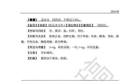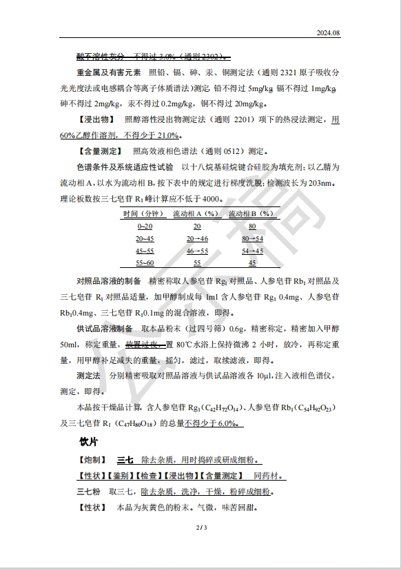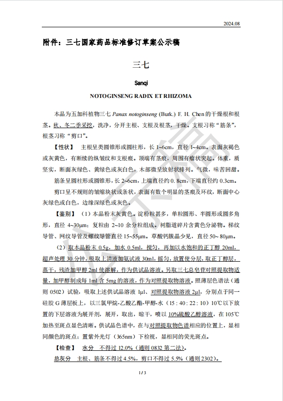 修订草案中将三七总皂苷总量由不少于5.0%提升至6.0%,水分由不超过14.0%改为不超过12.0%,总灰分由不超过6.0%改为主根、筋条不超过4.5%,剪口不超过5.5%。