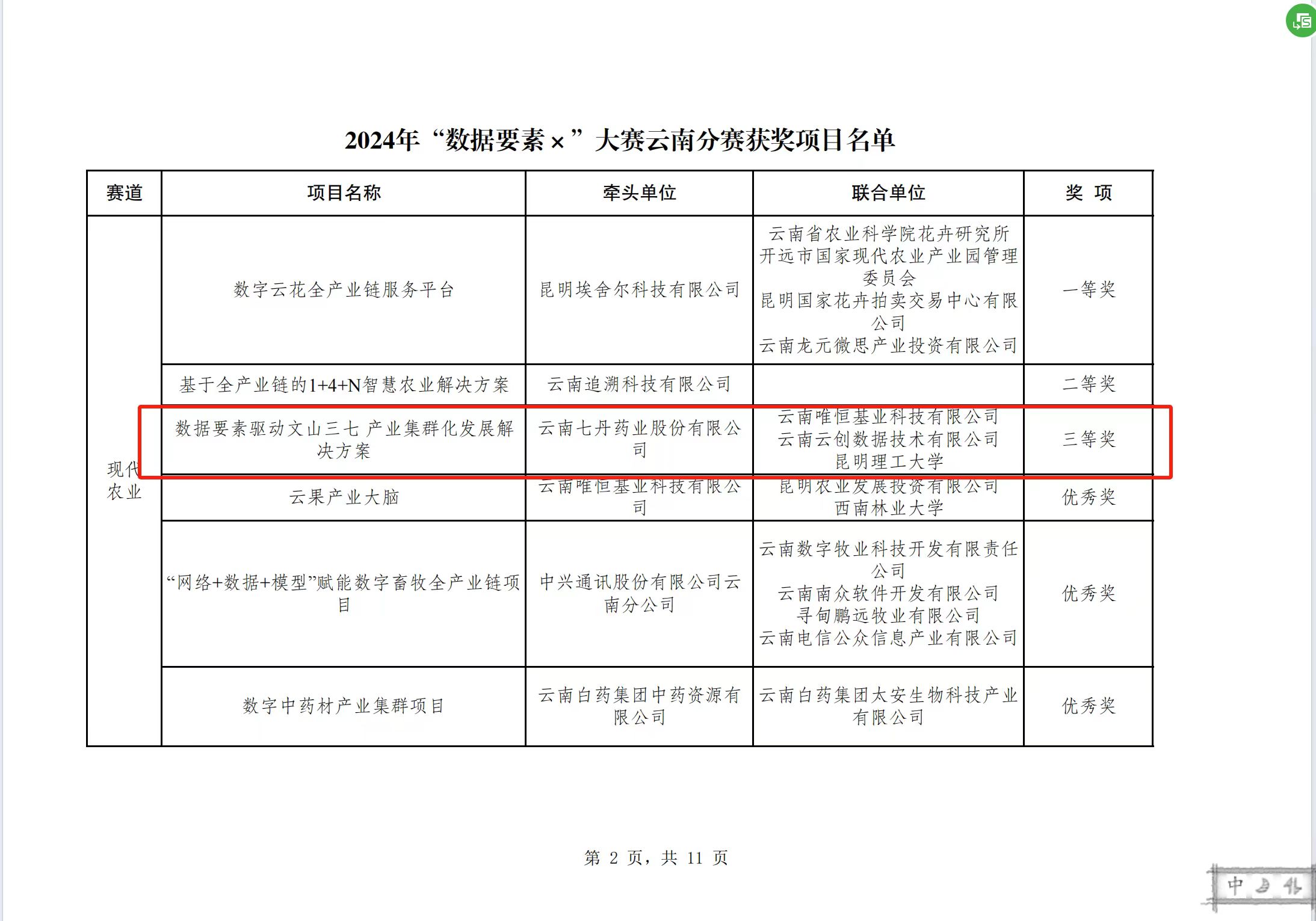 牵头,联合云南唯恒基业科技有限公司、云南云创数据技术有限公司、昆明理工大学共同制作的项目《数据要素驱动文山三七产业集群化发展解决方案》获2024年“数据要素x”大赛云南分赛-农业组三等奖。此次大赛以“数据赋能,乘数而上”为主题,旨在充分发挥数据要素乘数效应,发掘和培育数据应用的新模式、新业态,推动数字经济高质量发展。
