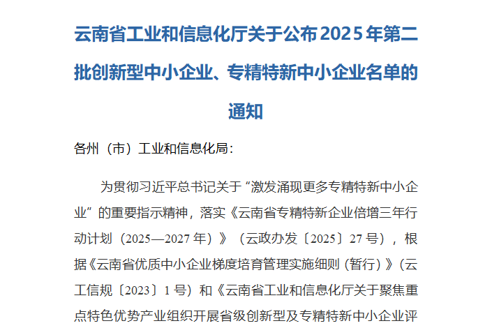 近日,云南省工业和信息化厅公布2025年创新型中小企业及专精特新中小企业名单,星空电竞·(中国区)官方网站 xkdj