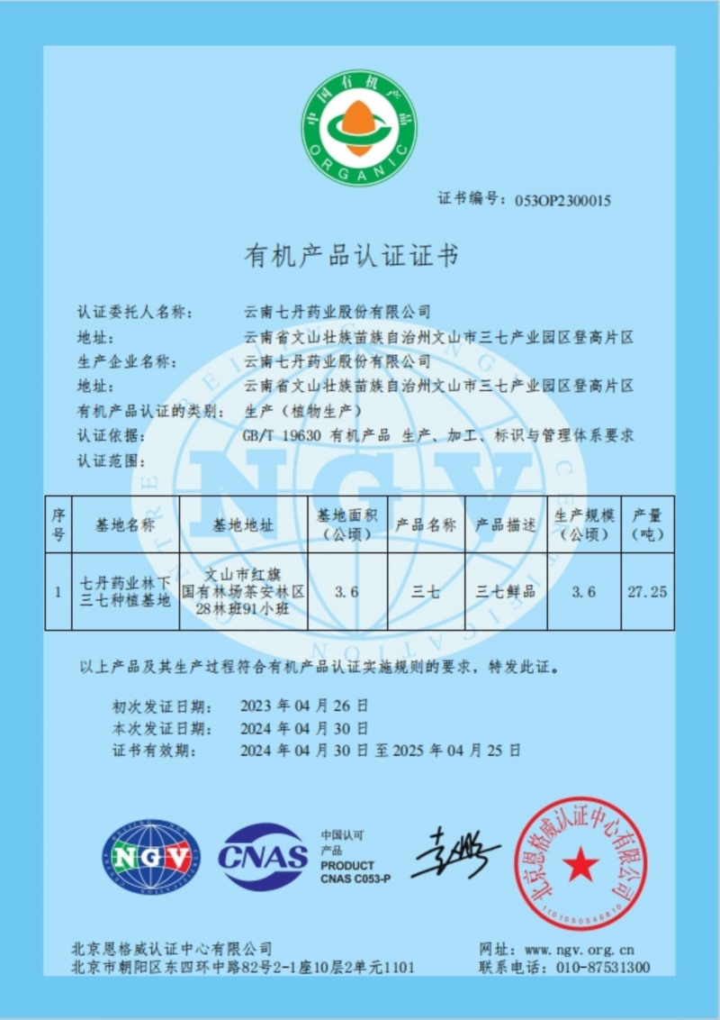 近日,星空电竞药业位于文山市红旗国有林场的林下三七种植基地获“有机产品认证证书”,标志着星空电竞药业创新三七种植技术取得新突破。