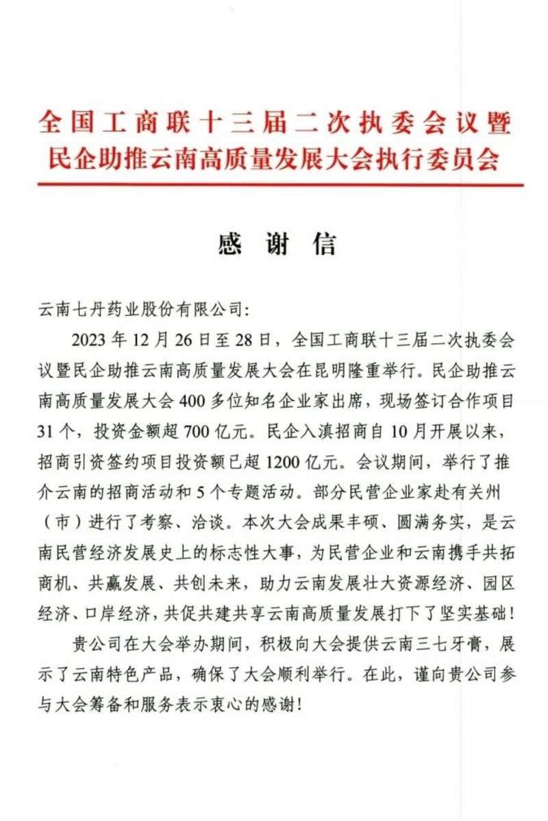 近日,全国工商联十三届二次执委会议暨民企助推云南高质量发展大会执行委员会给星空电竞药业发来感谢信,感谢星空电竞药业对大会的支持与协助。