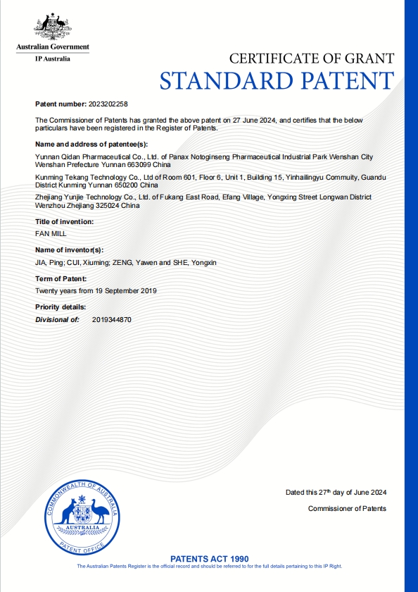 近日,星空电竞·(中国区)官方网站 xkdj 通过PCT(专利合作条约)途径申请的“鲜三七快速干燥工艺技术及设备”国际专利在澳大利亚获得授权。这是星空电竞药业继2021年获得南非专利...